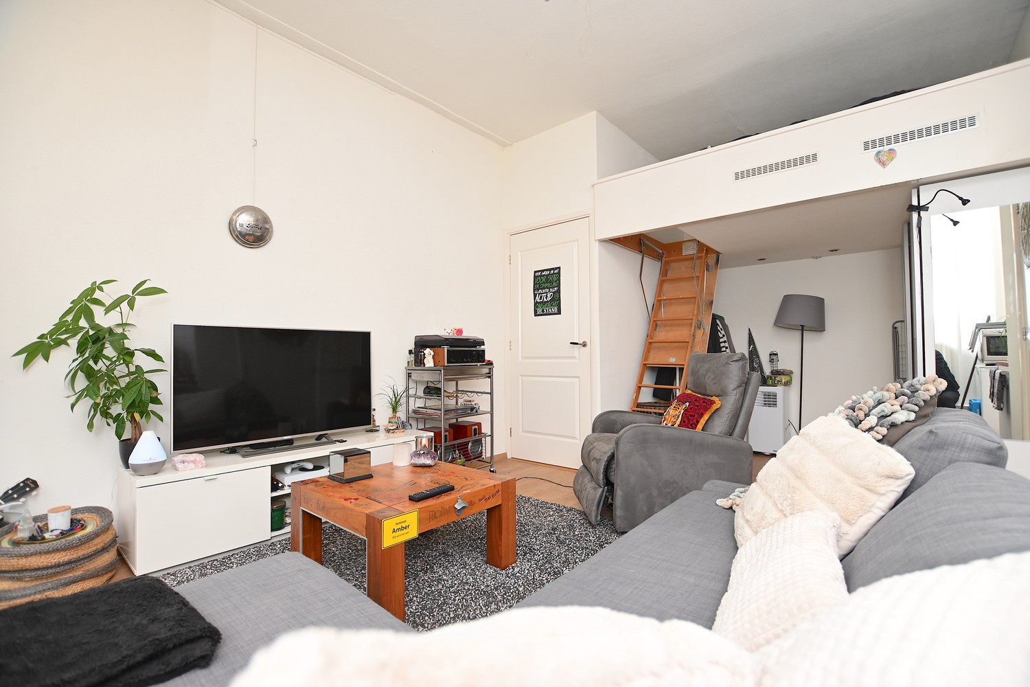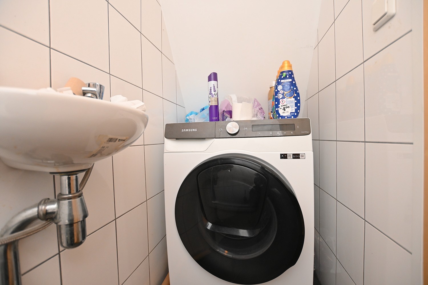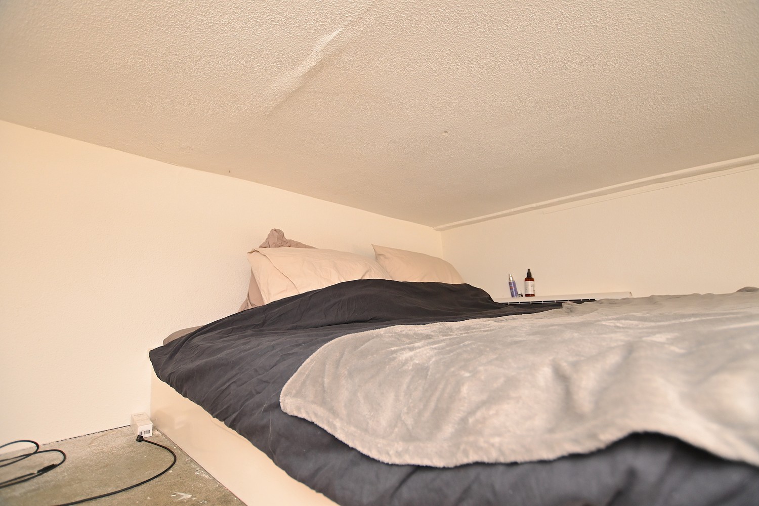 The living area consists of a room with large windows, so there is plenty of natural light inside. There is a spacious kitchen with all amenities and a neat bathroom with shower and sink. Also, the studio has a sleeping loft with enough space for a double bed. The toilet is located in the hallway, shared with three other residents. Here is also the washing machine.