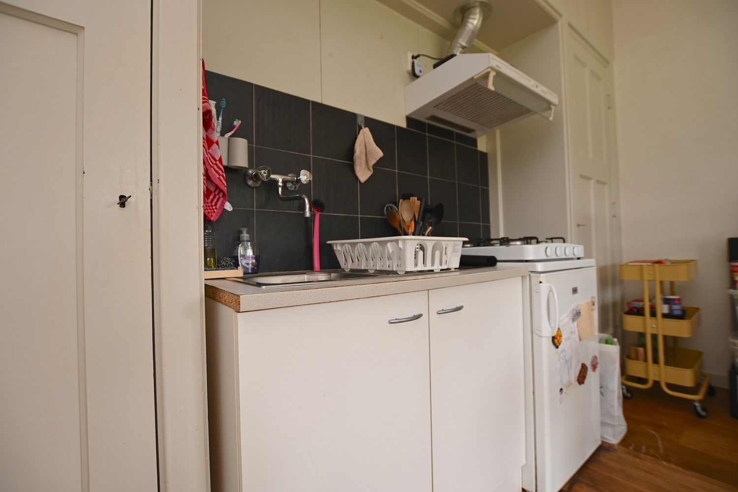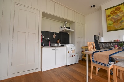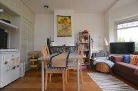 Through the common hall you enter the spacious room which is located on the front of the house. The room consists of two parts: A living room with open kitchen and a sleeping area. It has its own practical kitchen. In addition, you come through a passageway into the second room where you can make a sleeping area. In the second part of the living area there is a private shower cabin. The toilet is located in the hallway and is shared with two co-tenants as well as the washing machine located in the hallway.