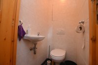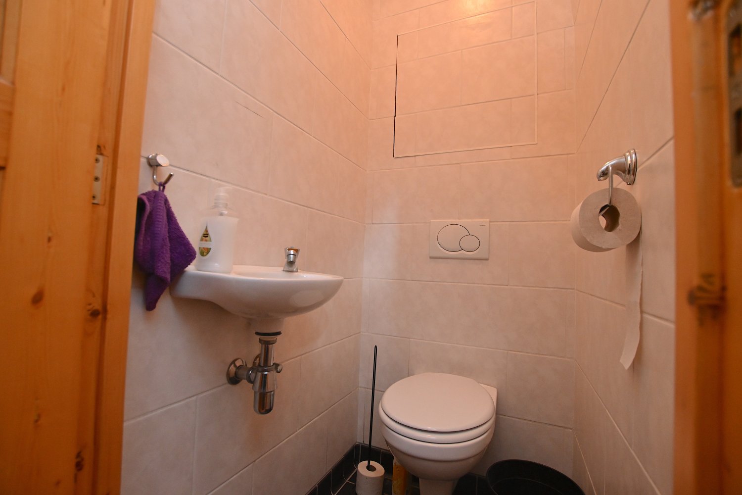 The stairs lead to the hall, which provides access to the spacious living room with large windows that let in plenty of light. There is both a spacious sitting area and a spacious dining area. The living room leads to the sleek kitchen, which is fully equipped. The kitchen also provides access to the large roof terrace. The property also has a toilet and a bathroom with a bath, shower, and sink. There are two bedrooms, one of which has a balcony.