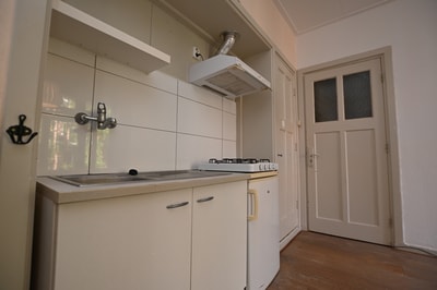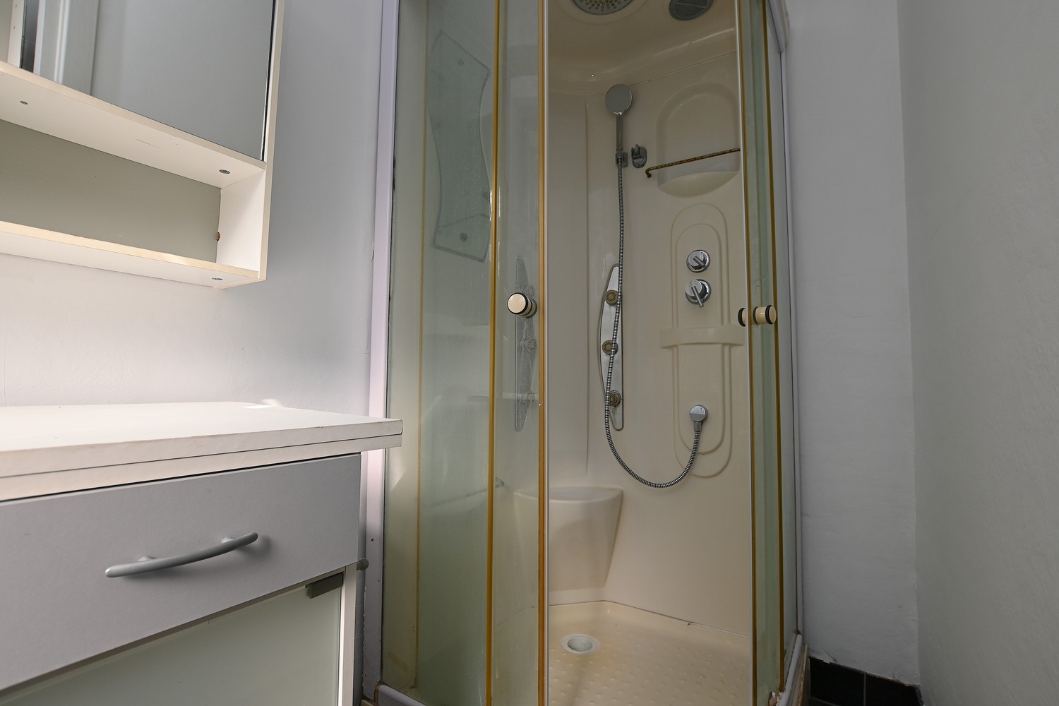 Through the shared hallway, you enter the spacious room, which is situated at the rear of the property. The room is divided into two sections. Upon entering, you have the living room with an open, practical kitchen, and through the door, you have access to a bedroom with an attached bathroom. This layout allows for a good separation of living and sleeping areas. There is access to a shared balcony from the kitchen, which you share with one housemate. The toilet is located in the hallway and is shared with two other housemates, as well as the washing machine, which is also in the hallway.