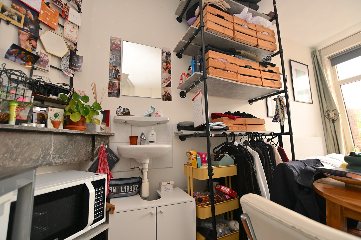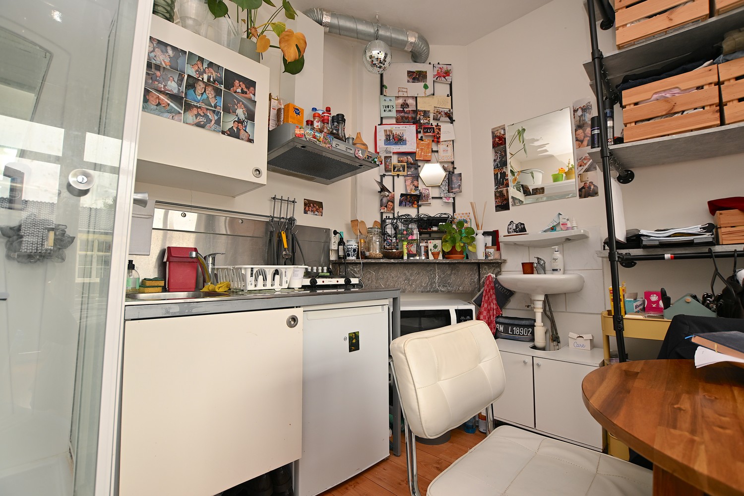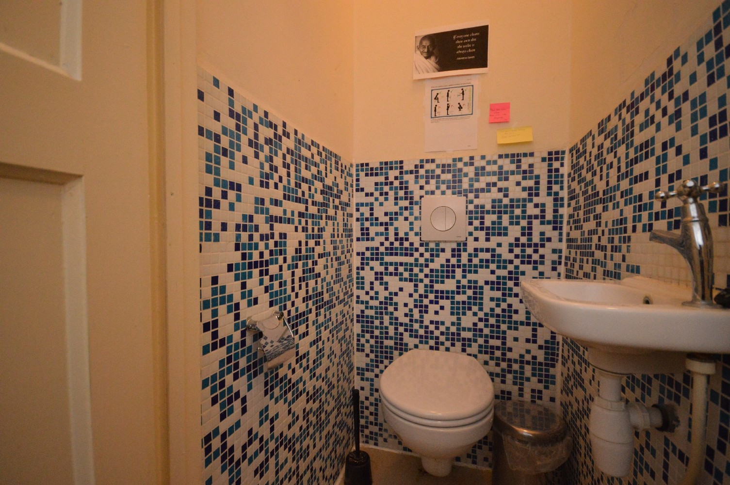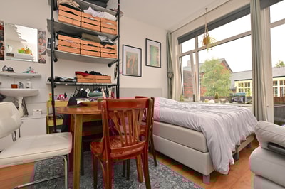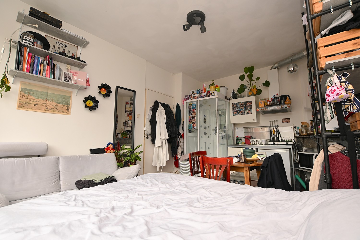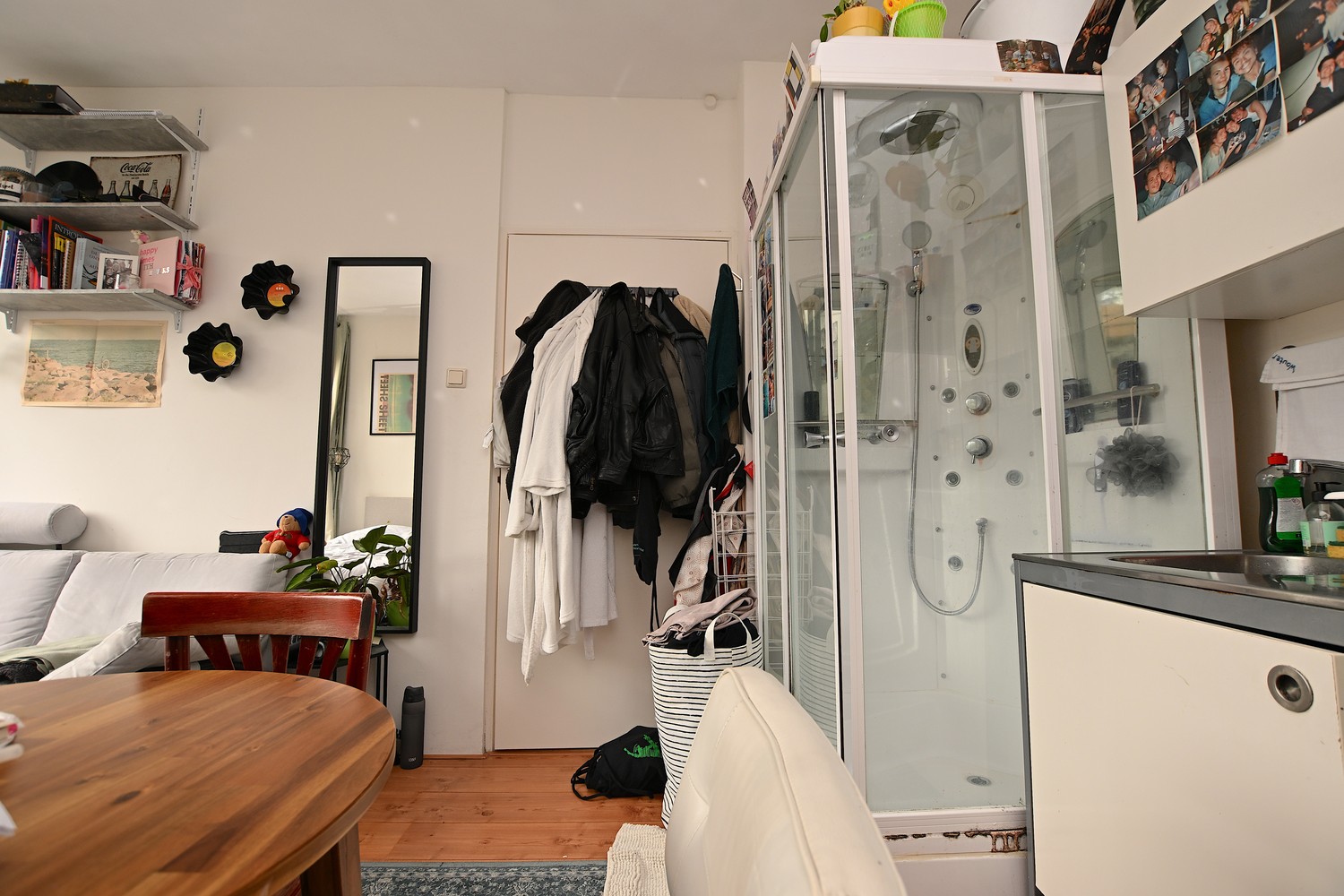 The studio is located on the first floor at the rear. The studio has large windows, allowing plenty of natural light to enter. It has its own kitchen and shower, as well as a private balcony where you can sit and enjoy the summer. Only the toilet is shared with four other residents.