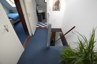 The bedroom and bathroom with toilet are located at the front of the property. At the entrance is a very spacious hall, which serves as an extra room where a workspace could be created. At the rear is the living room with open kitchen. The sunny balcony is accessible through the living room, with a beautiful view of a green courtyard garden. The property has central heating.