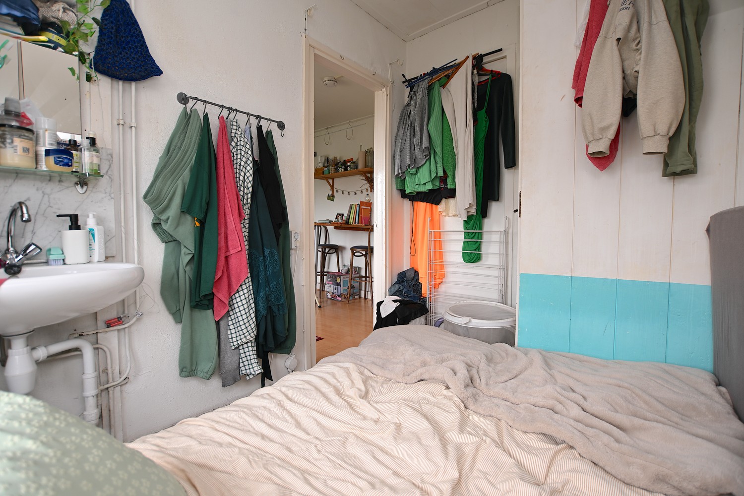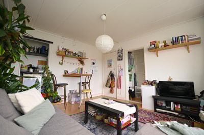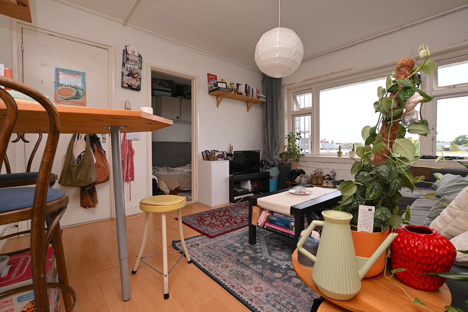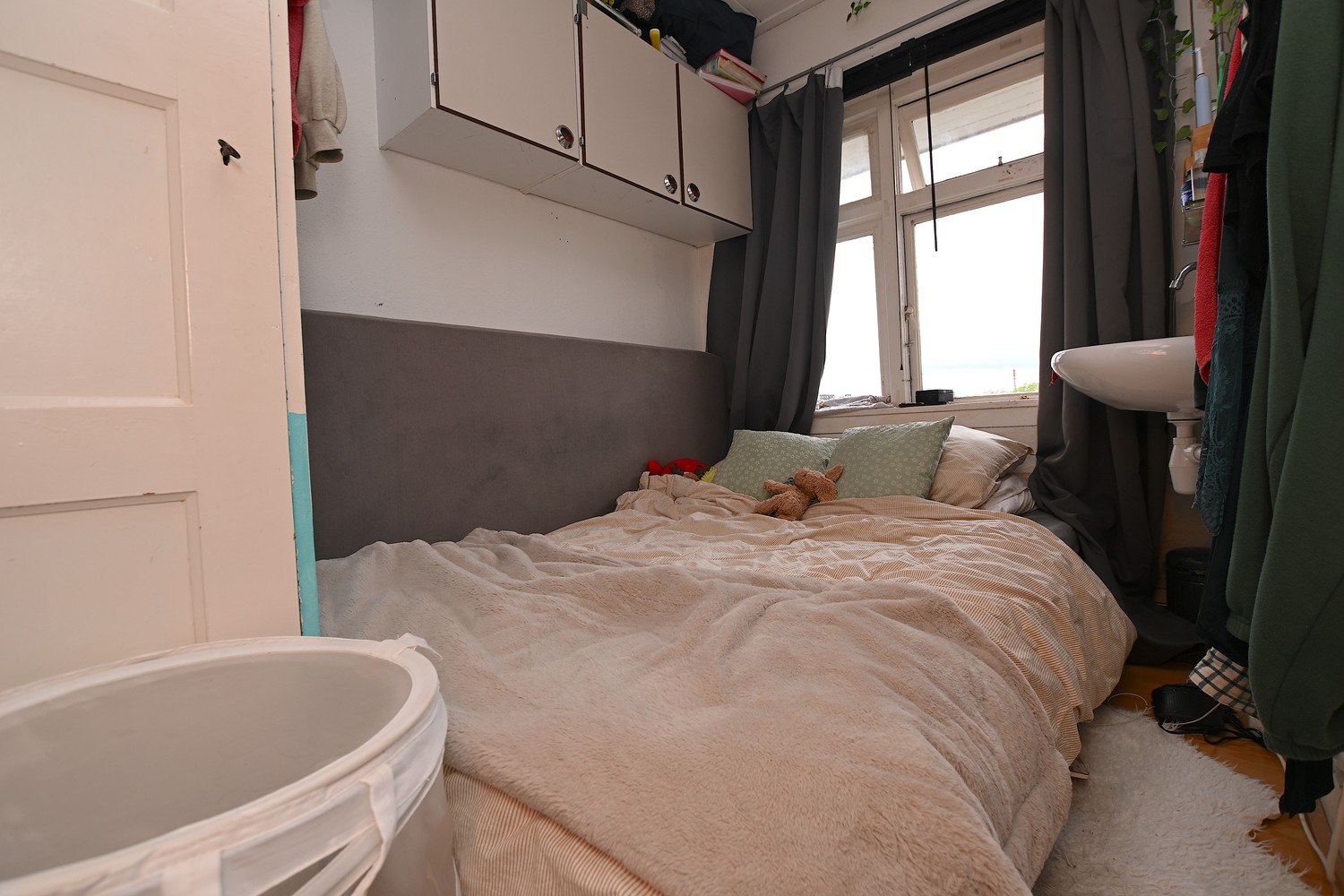 The room is located on the second floor at the back of the house. There is enough space for a spacious sitting and dining area. Thanks to the built-in cupboards, there is also enough space for all your stuff. There is also enough space to fit a bed.