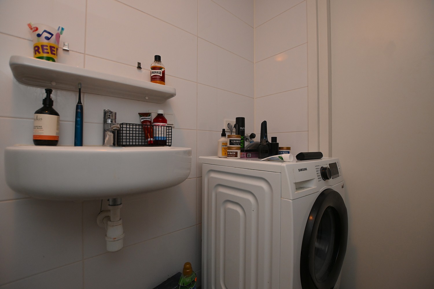The bathroom has a walk-in shower, sink, and connection for a washing machine. The toilet is separate from the bathroom.