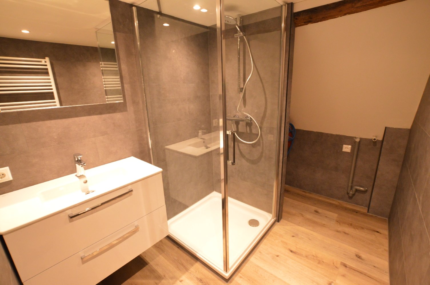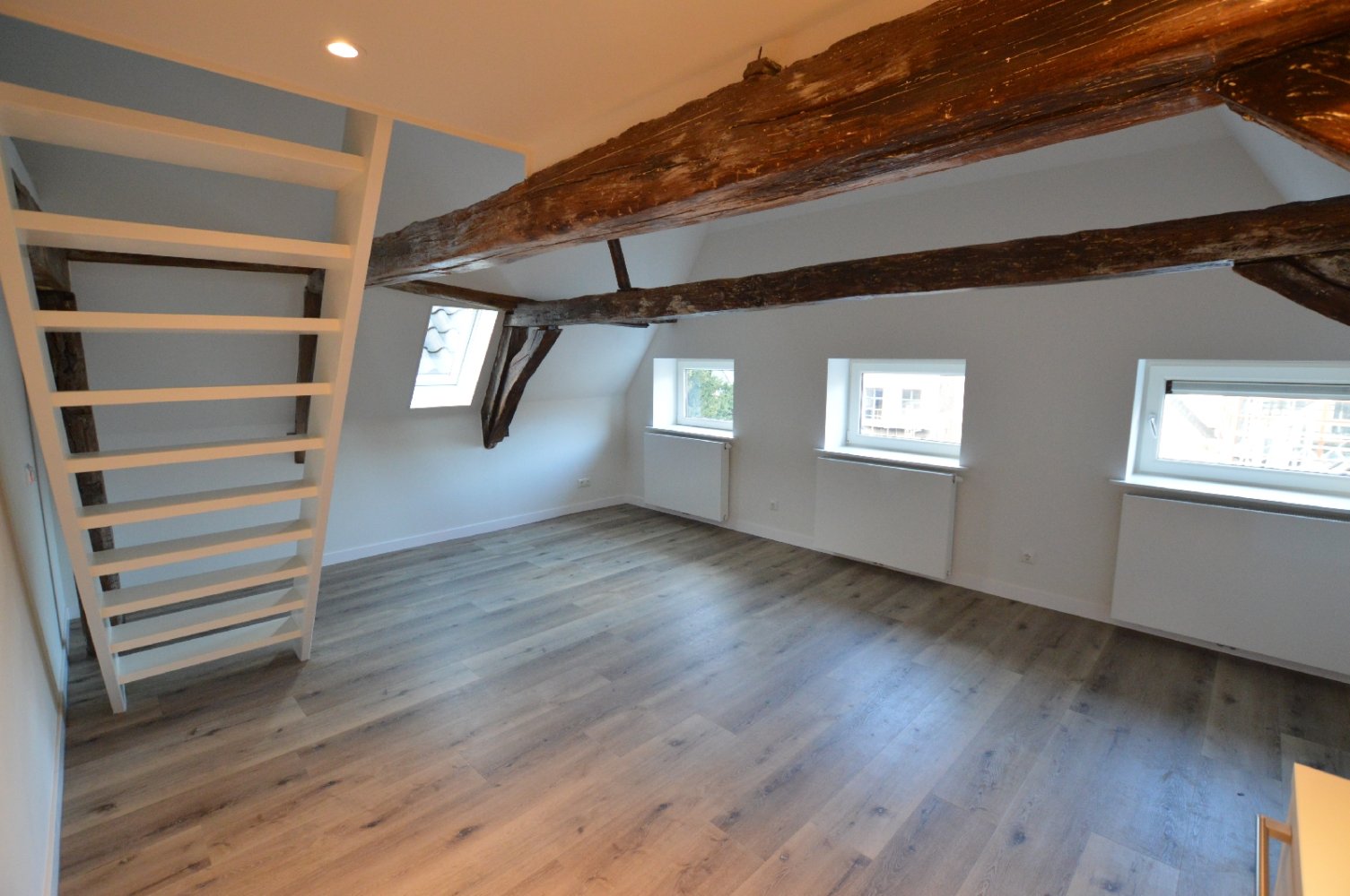 The living space features a nice living room with open kitchen, a separate sleeping loft and a bathroom with shower and toilet. The kitchen is equipped with a built-in fridge, hob, dishwasher and is luxuriously finished. The bathroom is equipped with sink plus cabinet, hanging toilet and a shower. The rooms are all delivered with flooring.