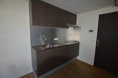 It is unfurnished and equipped with PVC flooring and curtains. The kitchen is equipped with an electric hob, extractor fan and fridge freezer. The bathroom has a shower, washbasin with cupboard underneath and a hanging toilet. Both the kitchen and bathroom have a modern look.