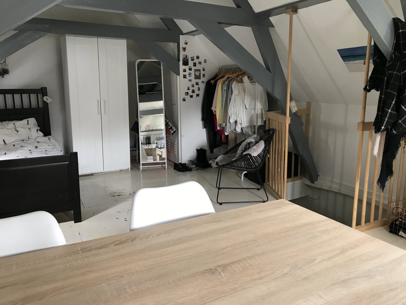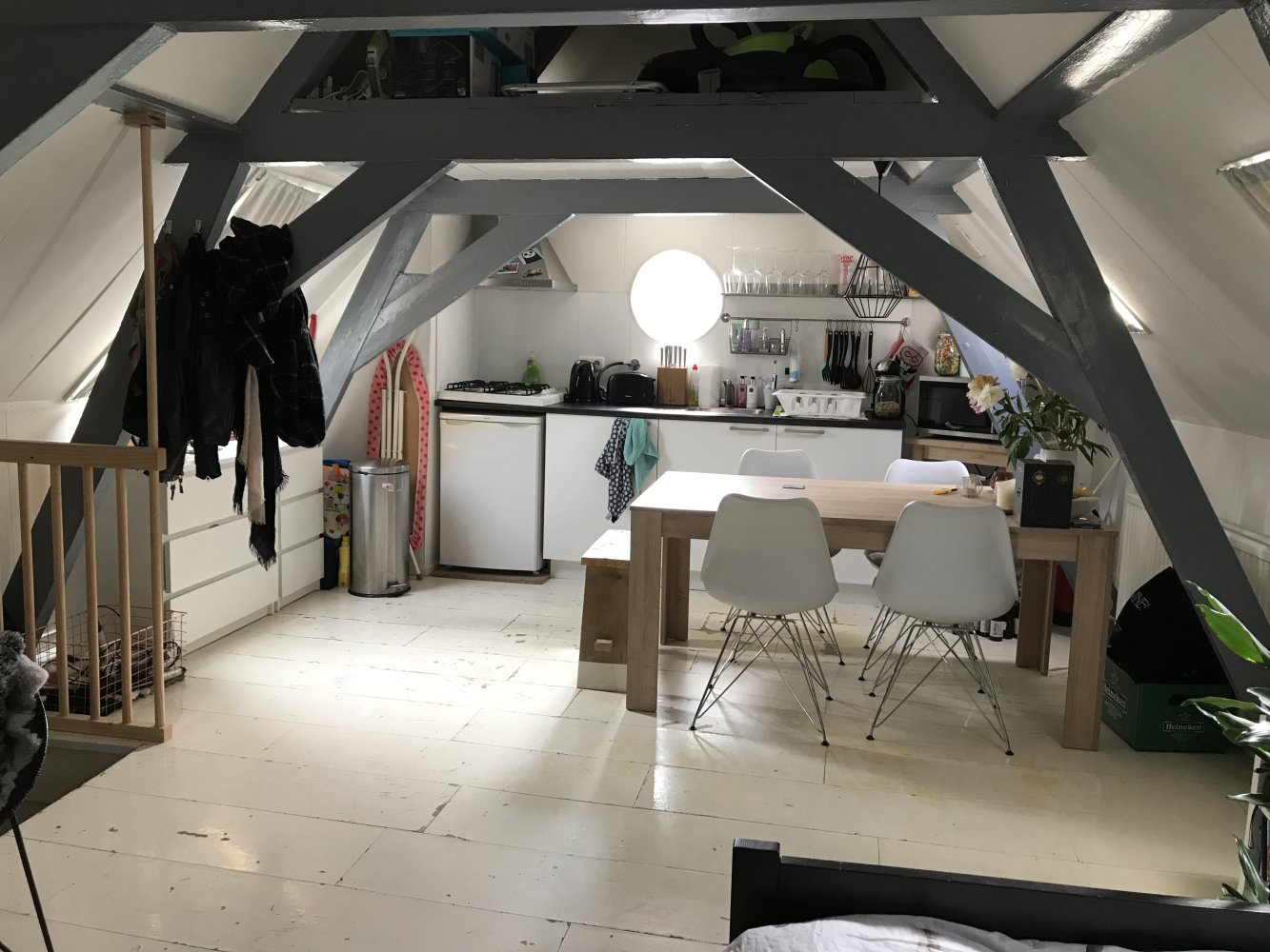 The room is situated on the second floor of the building. It includes a private kitchen and a loft, which can be used as a sleeping area or for storage. The bathroom and toilet are shared with the other three housemates.