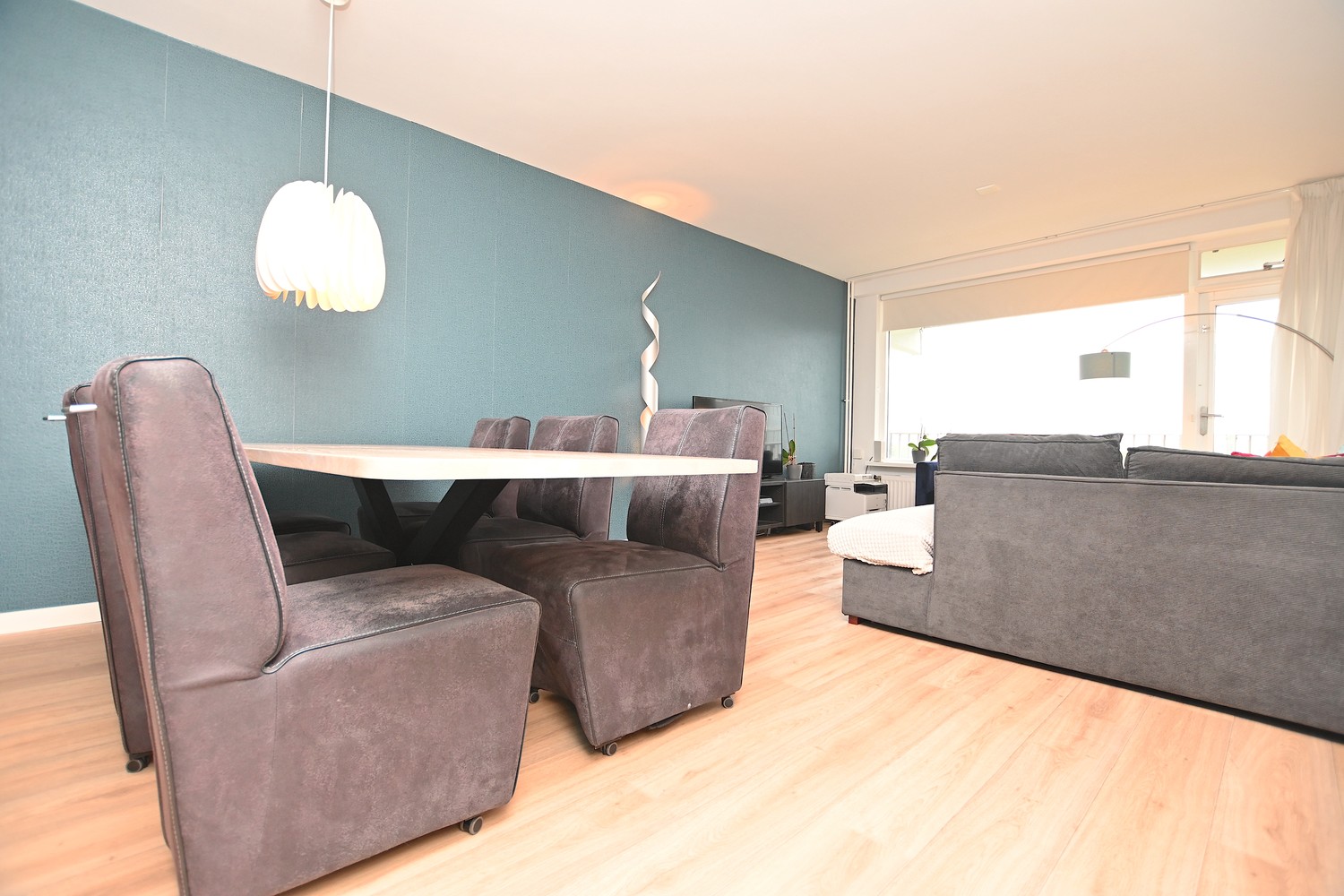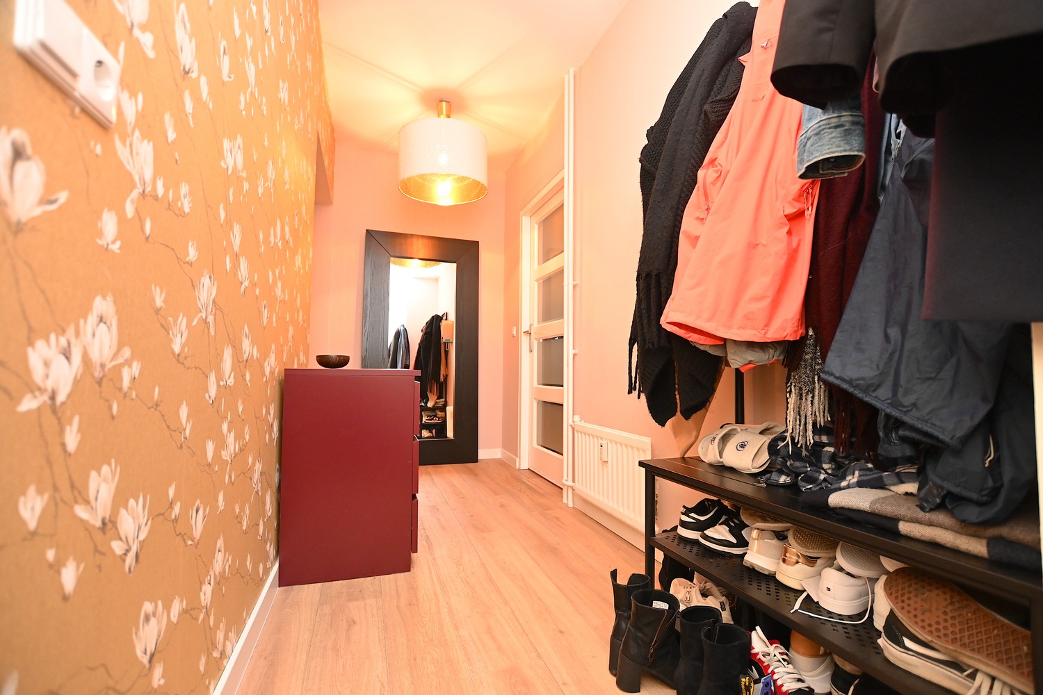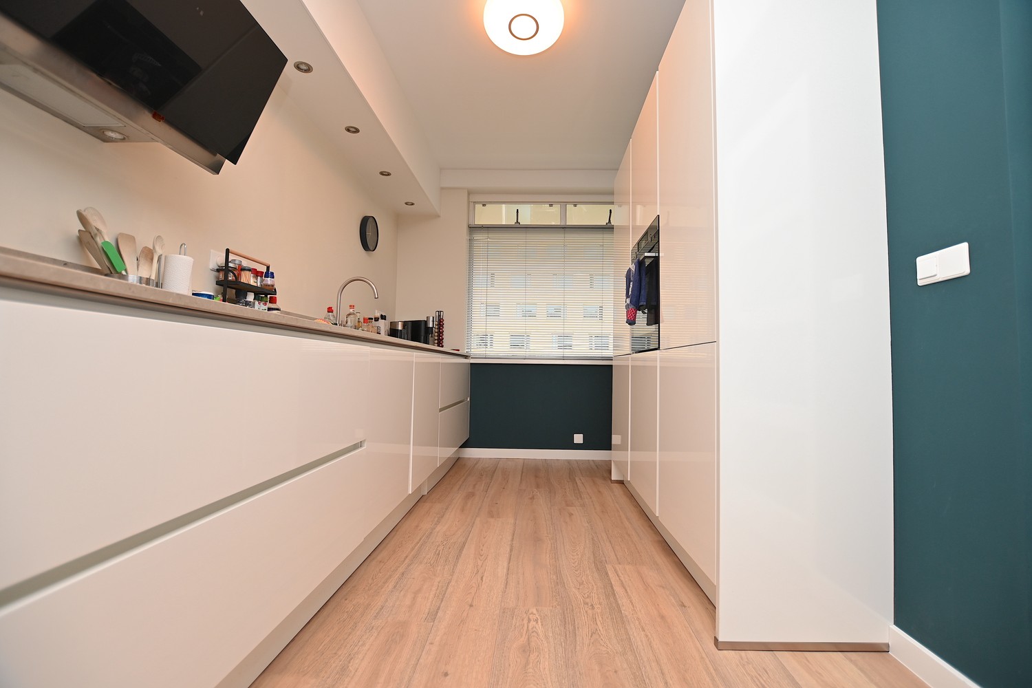 Through the shared entrance, you can take the elevator or stairs to the sixth floor where the apartment is located. From the gallery, you have a view over the city. Upon entering the apartment, you enter the spacious hallway, with the living room and open kitchen located on the right. The luxury kitchen is equipped with, among other things, an induction cooktop, dishwasher, refrigerator, and freezer. The living room is very spacious and the large windows provide plenty of natural light. The balcony is also accessible through the living room.