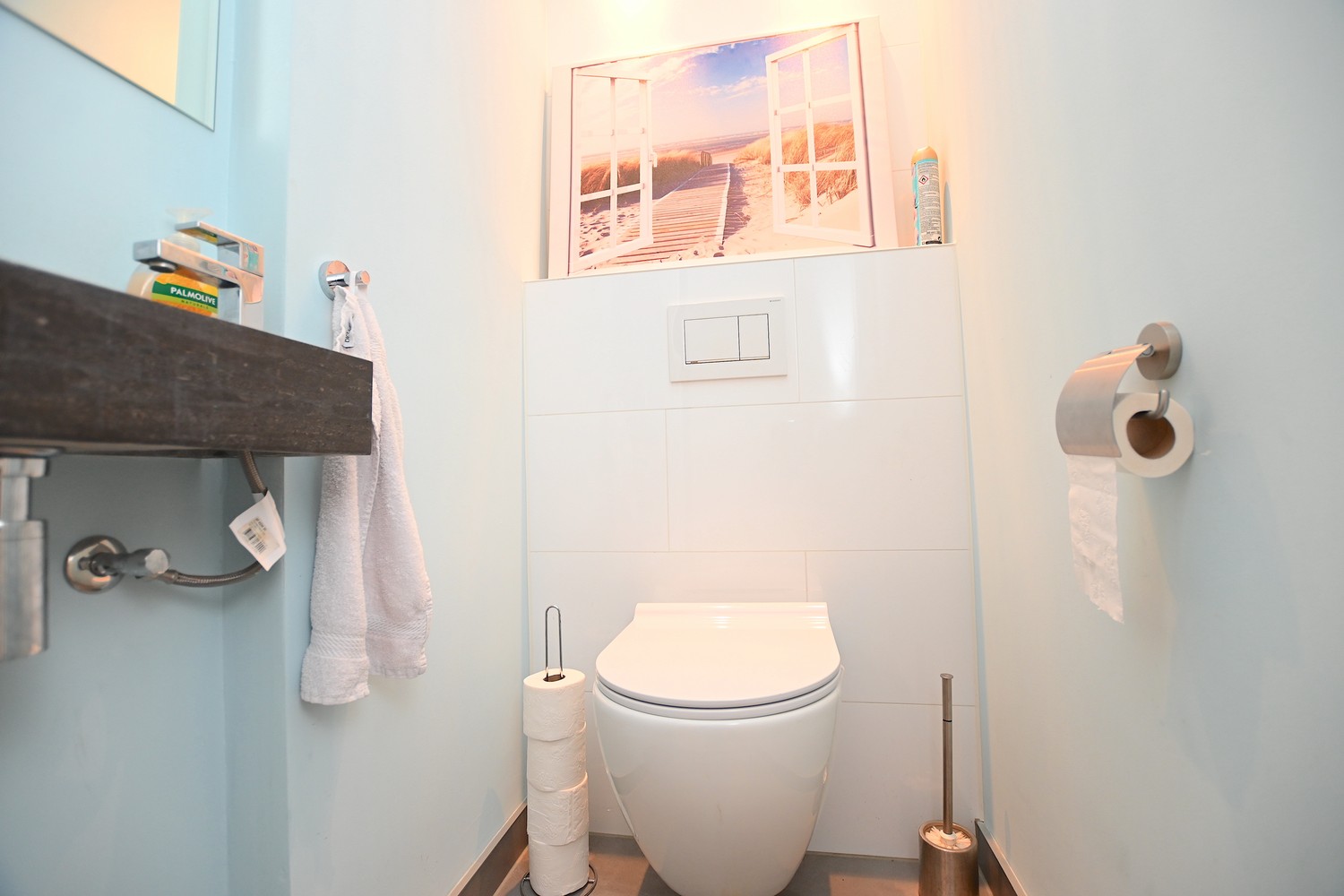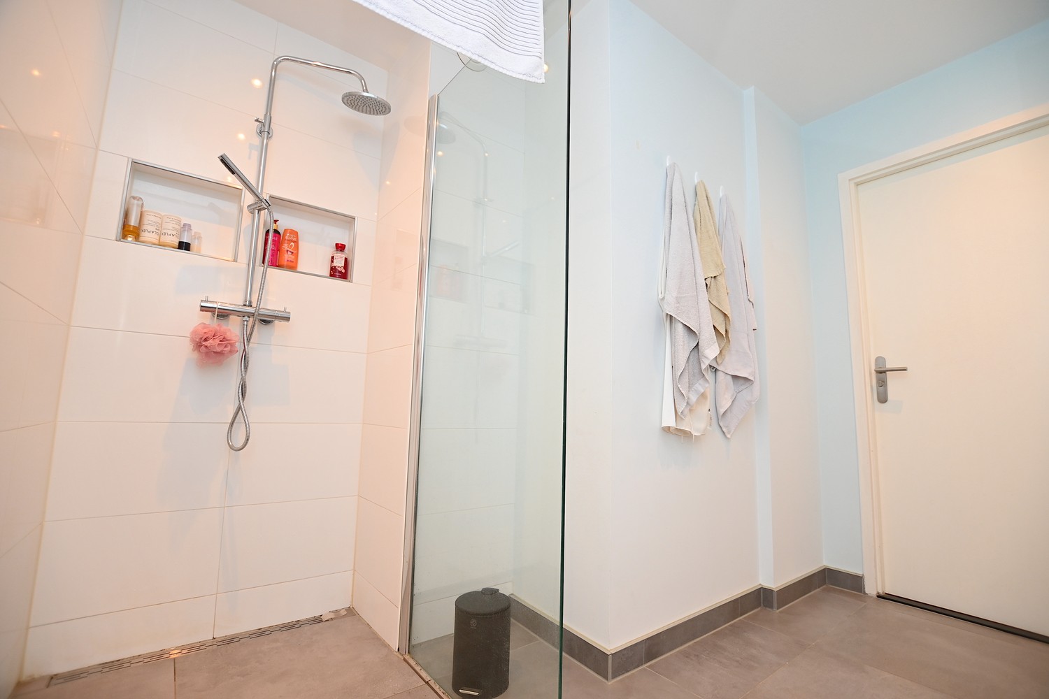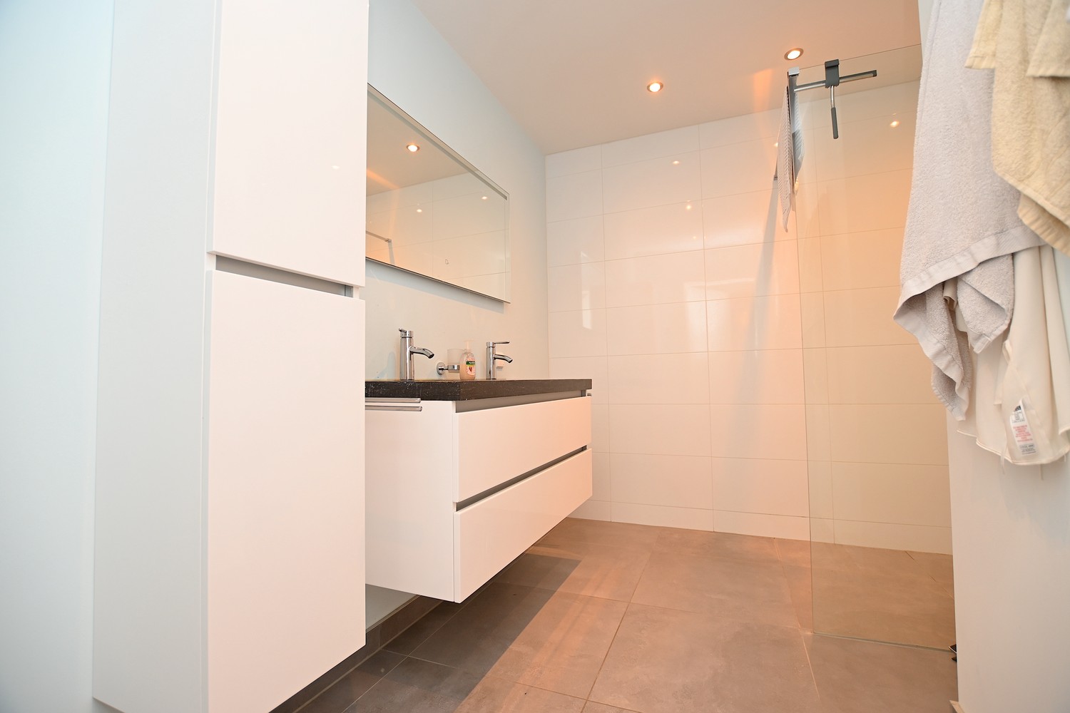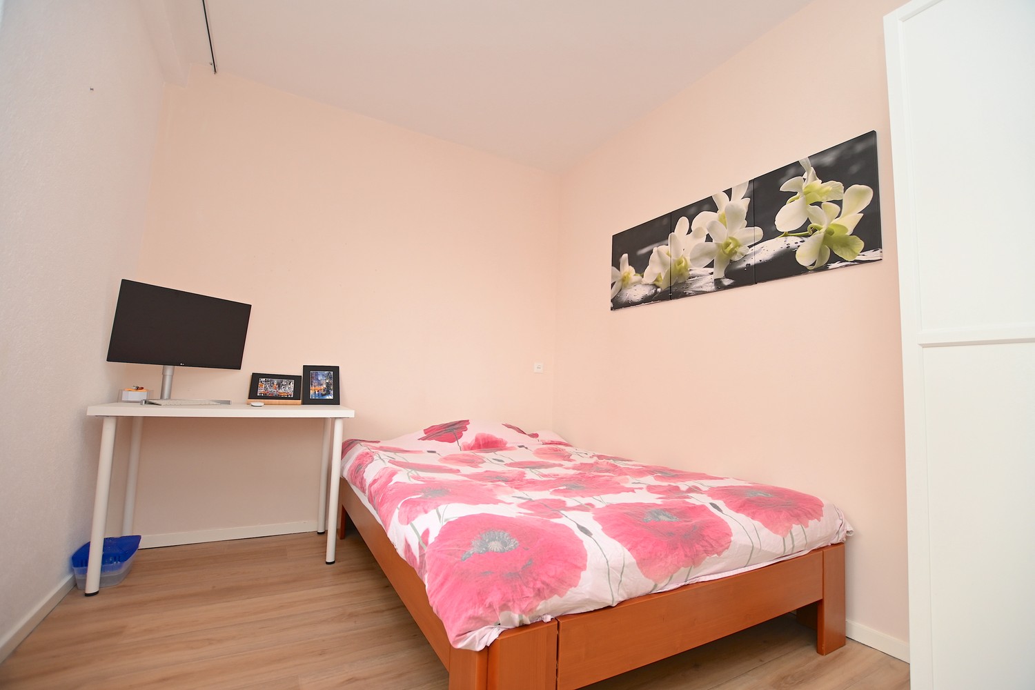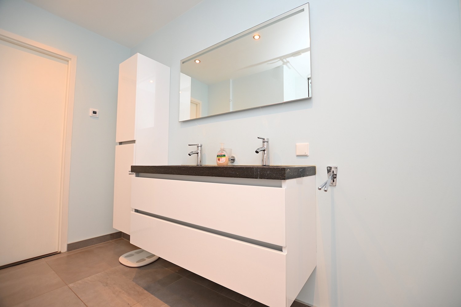 The room itself is accessible via the hallway, with enough space for a double bed and a wardrobe. The modern bathroom is equipped with a double sink, mirror, and walk-in shower. The toilet is separate from the bathroom. There is also a storage room on the ground floor.