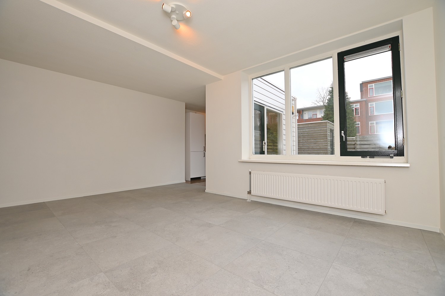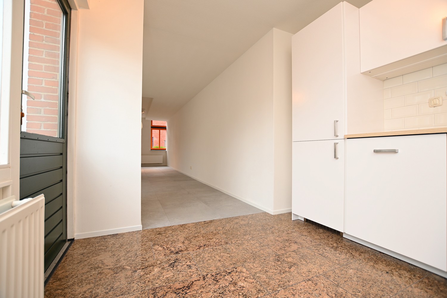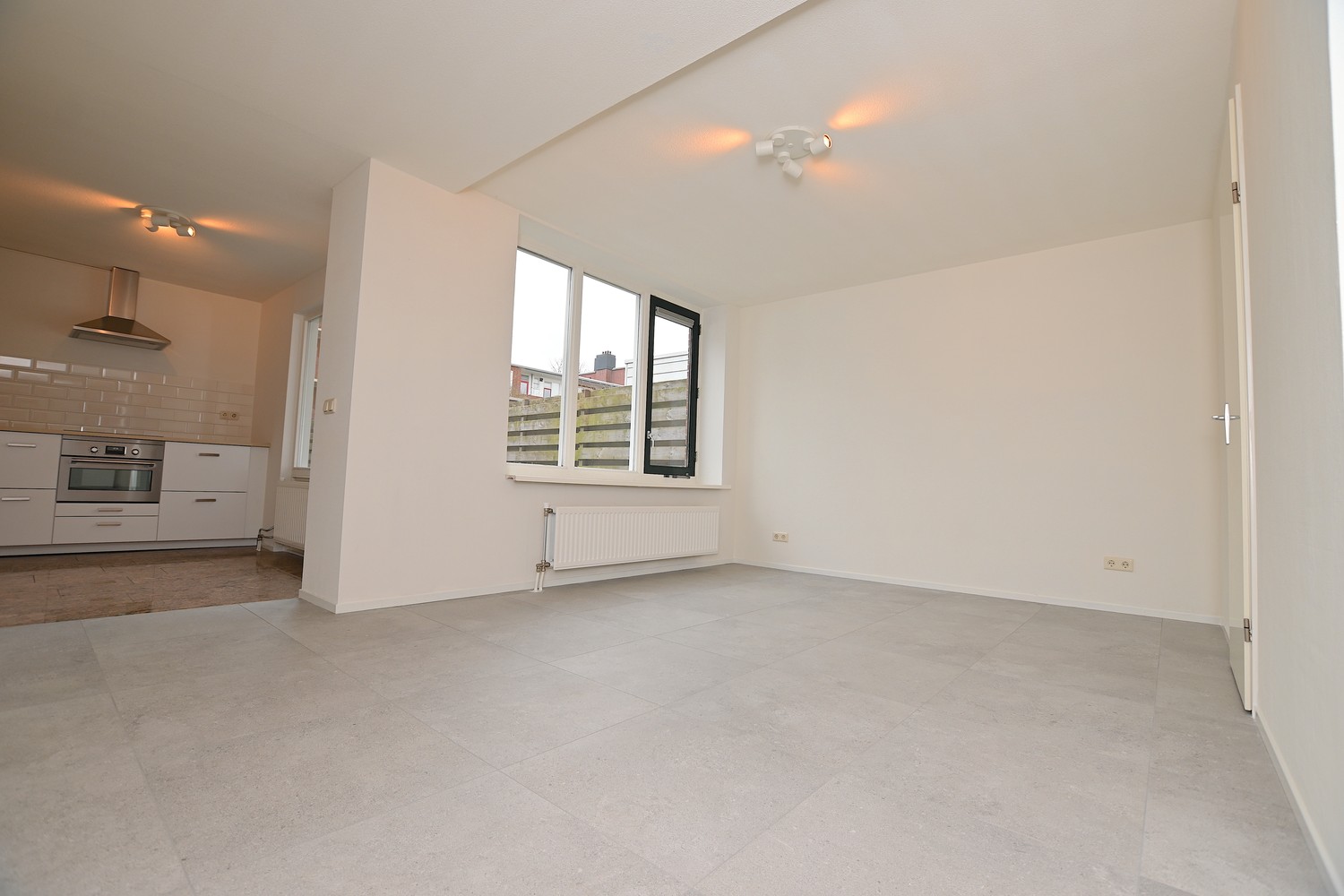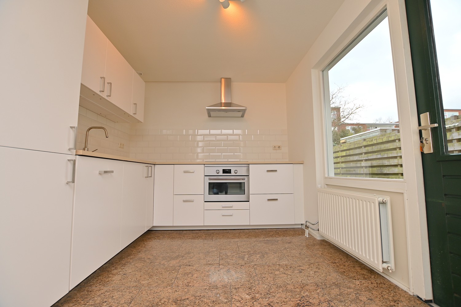 Upon entering through the front door, there is a door to the living/dining room. The ground floor is an open space that could also be arranged as a closed space by using the partition wall. A lot of daylight enters the property through the windows at the front and rear of the house. At the rear of the property, the new kitchen is located. The kitchen is equipped with an oven, dishwasher, sink, tap, freezer, and a large refrigerator. Furthermore, there is sufficient storage space available in the kitchen.