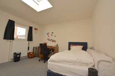 The room has enough space for a double bed, desk, and wardrobe. The house is shared with 6 other residents. You will share the large 43 m² living room, the kitchen, which has a dishwasher, oven, sink with tap, gas stove, and plenty of workspace to prepare your meals. There are two shared bathrooms. The house also has a large roof terrace and a balcony directly opposite your room.
