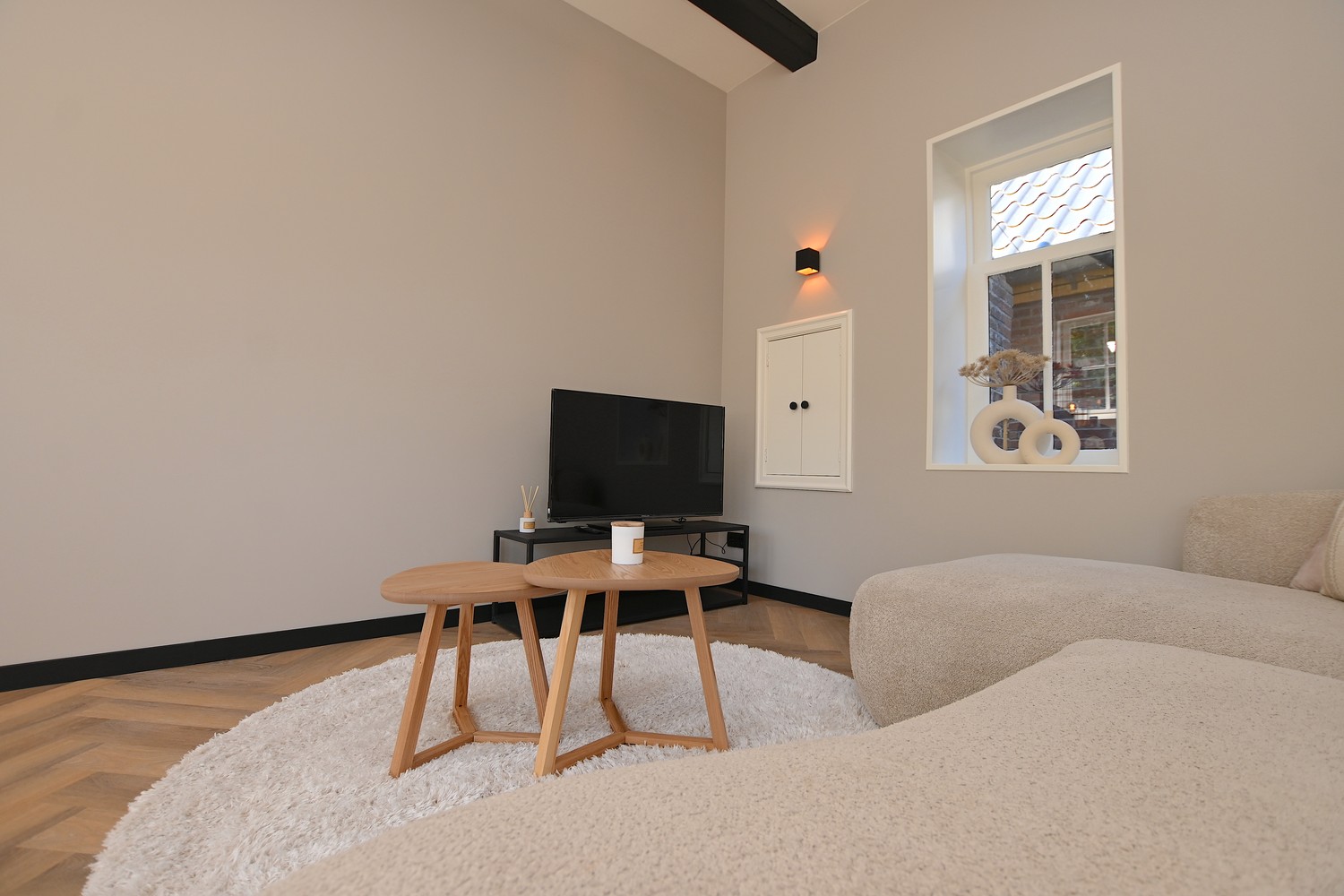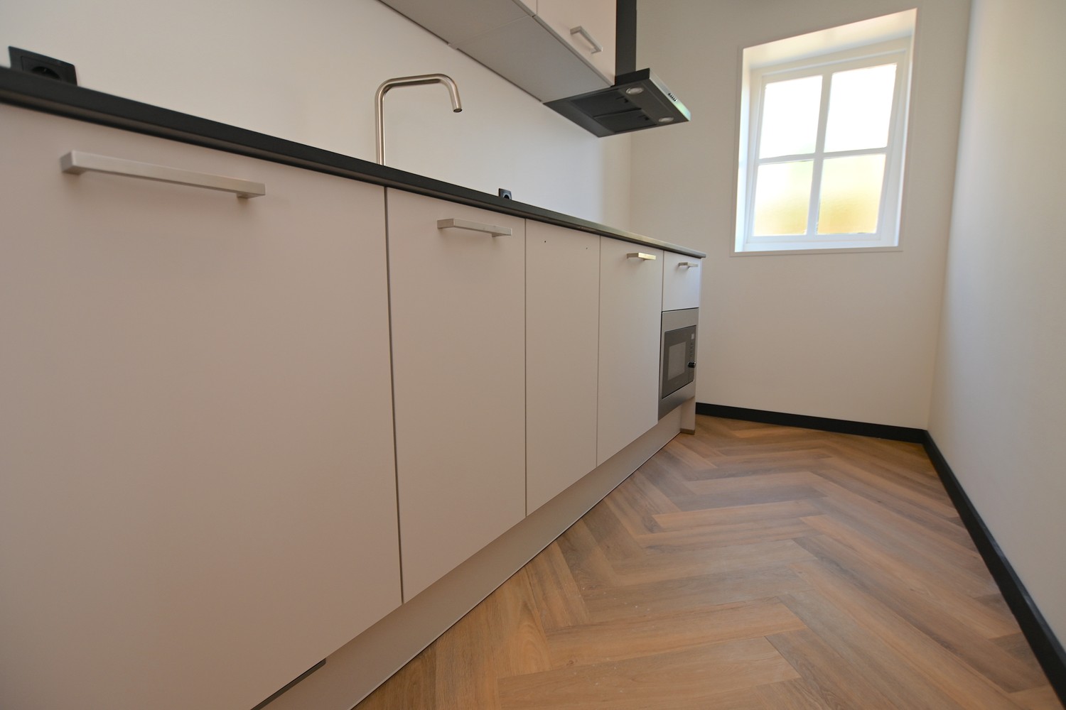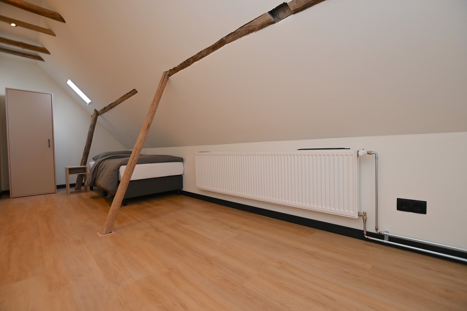 Through the front door you enter the spacious hallway which gives access to the bright living room. In the living room the old elements of the building have been preserved and combined with modern aspects. Adjacent to the living room is the sleek kitchen which is equipped with a refrigerator with freezer compartment, induction cooktop, extractor hood, combi oven and sink. The kitchen is also equipped with sufficient storage and workspace.