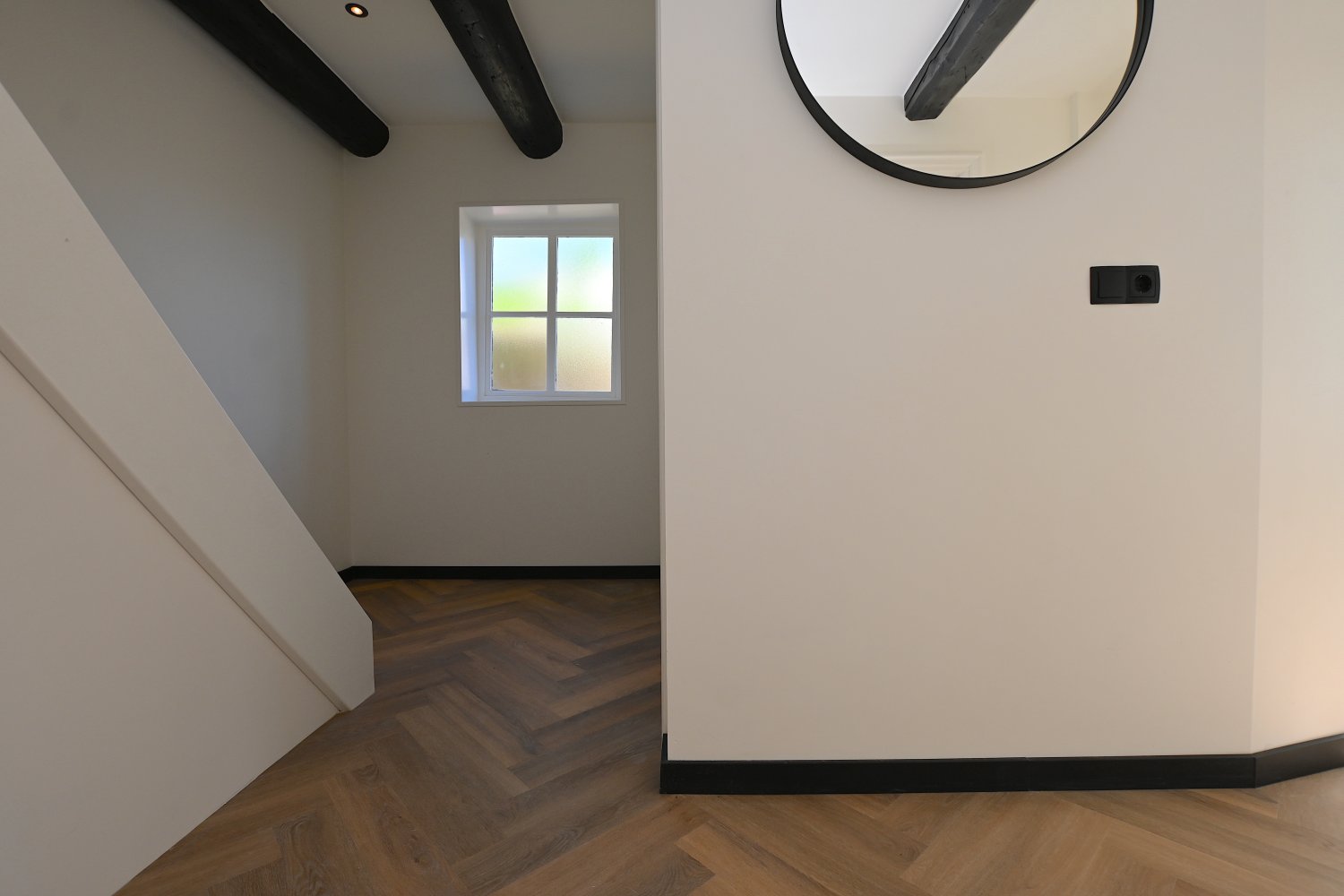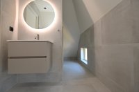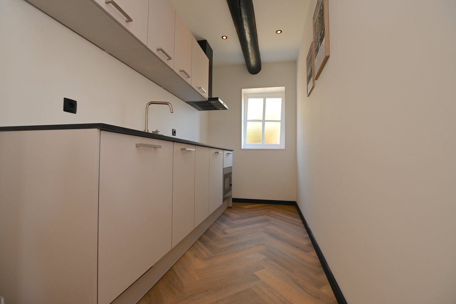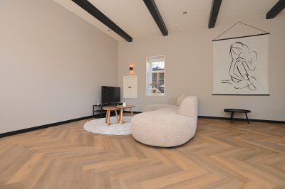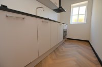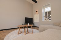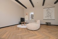 Through the front door you enter the spacious hallway which provides access to the bright living room. In the living room, the old elements of the building have been preserved and combined with modern aspects. Adjacent to the living room is the sleek kitchen which is equipped with a refrigerator with freezer compartment, induction hob, extractor hood, combi oven and sink. The kitchen also has sufficient storage and workspace.