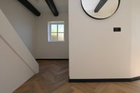 Through the hallway you also have access to the toilet and the laundry room, and the staircase to the upper floor is also located in the hallway. Here you arrive at the spacious landing which provides access to the two bedrooms where the characteristic elements of the building have been preserved, and also to the luxurious bathroom which is equipped with a rain shower, washbasin with vanity unit and second toilet. The apartment is delivered fully furnished.