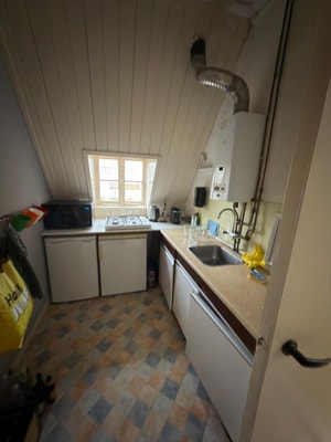 The semi-studio is located on the first floor at the rear of the building, overlooking the garden. The living space has a private kitchen with a dishwasher, induction hob, combination microwave oven, and fridge-freezer. There is also a washing machine connection. You also have a private shower, which you do not need to share.