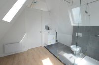The bathroom has a shower, sink, toilet and a connection for a washing machine. There is enough space to place a dryer here as well.