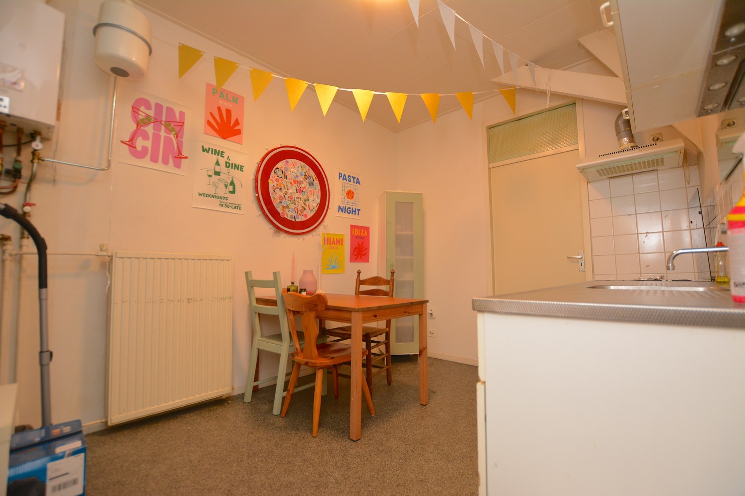 The room offers enough space for a double bed, wardrobe, a small dining area, and a seating area. Thanks to its practical layout, the space can be arranged comfortably. The room has its own sink. The kitchen is shared and equipped with an extractor hood and a 4-burner gas stove with oven. The bathroom is also shared, and there is a communal laundry room available.